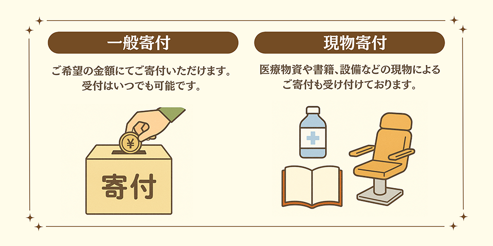 金銭のご寄付はもちろん、医療物資や図書、設備などの現物のご提供も歓迎しています。
