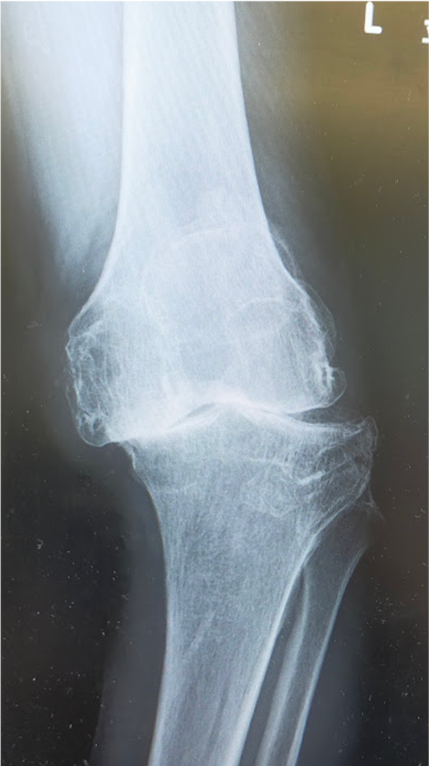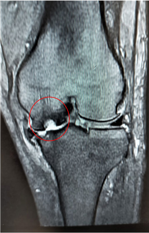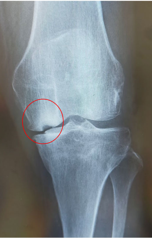 大腿骨顆部は体重を支えるのに重要で、過度なストレスが加わり壊死に陥ることがあります。原因としてステロイド投与や半月板損傷後などに脆弱性骨折(軽微な外傷により軟骨下骨に微小骨折を生じる)が起こり壊死に至るとされています。安静にしていても痛みが出たり、夜間寝ている間に痛みが出ることもあります。