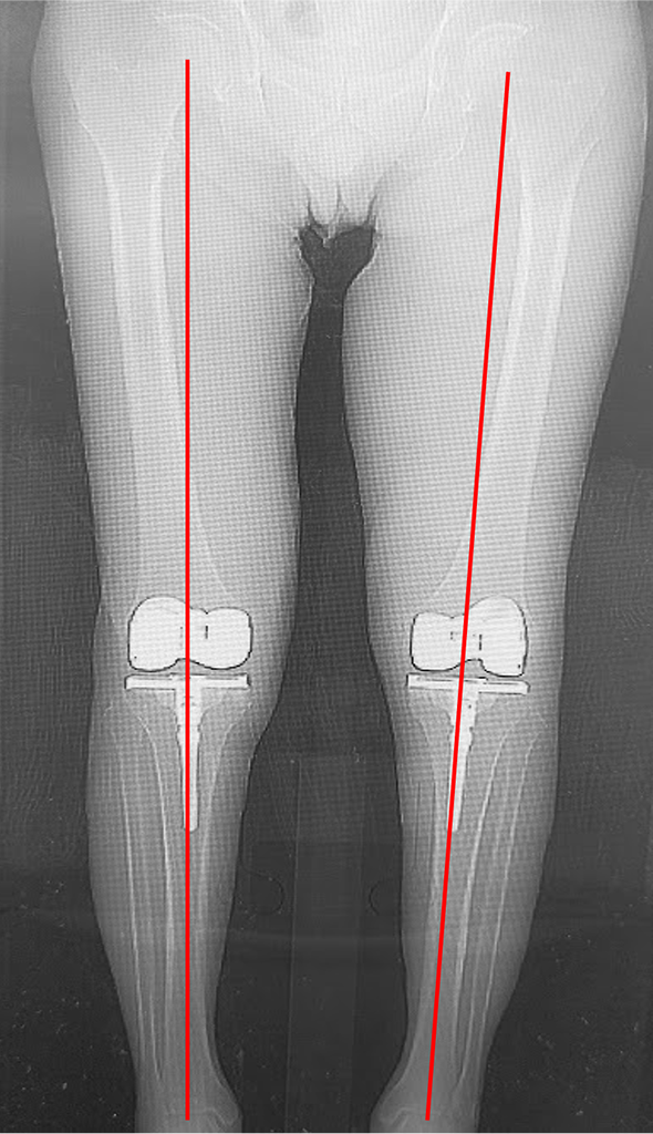 術前は高度なO脚を呈していましたが、術後は下肢がまっすぐになり、股関節と足関節の中心を結ぶライン(赤線)がひざ関節の中心を通っています。