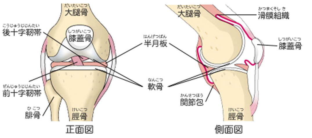 膝関節は、大腿骨(太ももの骨)と脛骨(スネの骨)、そして大腿四頭筋(太ももの筋肉)と膝蓋腱に支えられた膝蓋骨(お皿の骨)の3つの骨が組みあわさって出来ています。脛骨の上を大腿骨が滑り転がることでひざの曲げ伸ばしが可能になります。骨の表面は軟骨というクッションの役割をする組織で覆われ、間にある半月板も関節に加わる衝撃を吸収する役割があります。大腿骨と脛骨は強靭な靭帯(前後十字靭帯、側副靭帯)でつながり、ぐらつかないようになっています。