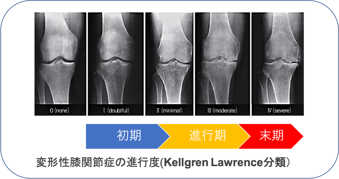 変形性膝関節症は一次性と原因疾患に続発する二次性に分類されます。わが国では年齢による退行性変化を主因とする一次性が多く、軟骨のすり減り、骨棘(骨のとげ)を伴い、多くは内反変形(O脚)を呈します。女性に多く、特に肥満との関連が強いといわれています。膝関節には歩行するだけで体重の3倍の力がかかるといわれており、病状の予防や進行を抑えるためには体重のコントロールが最も重要です。症状には波がありますが、次第に進行し、変形も悪化してきます。まずは保存加療を行いますが、痛みが強く日常生活に支障をきたすようだと、我慢するメリットはありません。痛みのない脚でより良い人生を送るために手術という選択肢もありますので、痛みで悩まれている場合は早めにご相談ください。