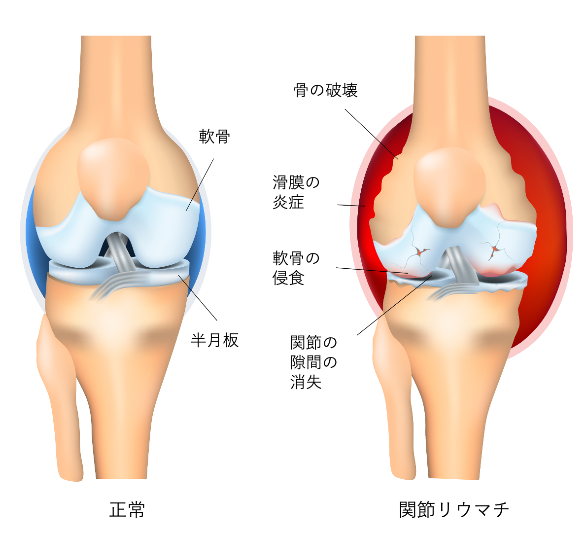 自己免疫性疾患(免疫の異常によって、体の正常組織を障害してしまう)の一種で全身のあらゆる関節の軟骨が障害される病気です。治療の基本は薬物治療で、近年は新薬の開発により治療成績が飛躍的に向上しています。しかしながら、膝・股関節などの大関節が障害を受けると日常生活が大きく障害されるため、人工関節が必要となることがあります。