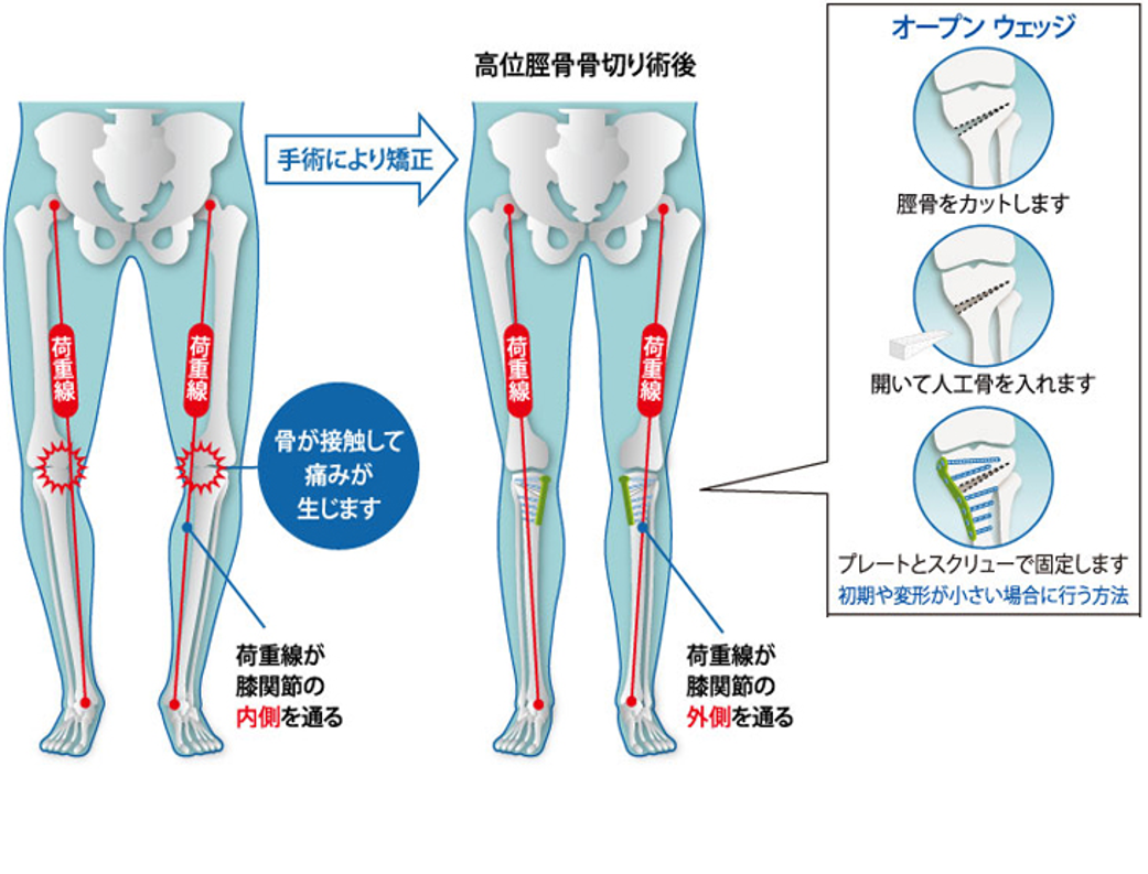 骨きり術の中でも、Opening Wedge法を採用しています。骨きり術とは、脛骨(すねの骨)の一部分に切れ目を入れて、間を広げ、O脚となっている脚を軽いX脚に矯正した状態でプレートで固定する手術です。体重のかかる軸を内側から外側に移動させることで痛みが取れ、また傷んだ軟骨も再生することが知られています。人工関節と異なり、“関節温存手術”と言われ、関節の機能が温存できる、低侵襲で合併症が少ない、良好な可動域(ひざを深く曲げることが可能)、スポーツなどに制限がない、などのメリットがあり若年者や比較的軟骨の残っている場合に行われます。 デメリットとしては、切った骨が治る(骨癒合)までに時間がかかり、リハビリ・社会復帰にやや時間を要することです。