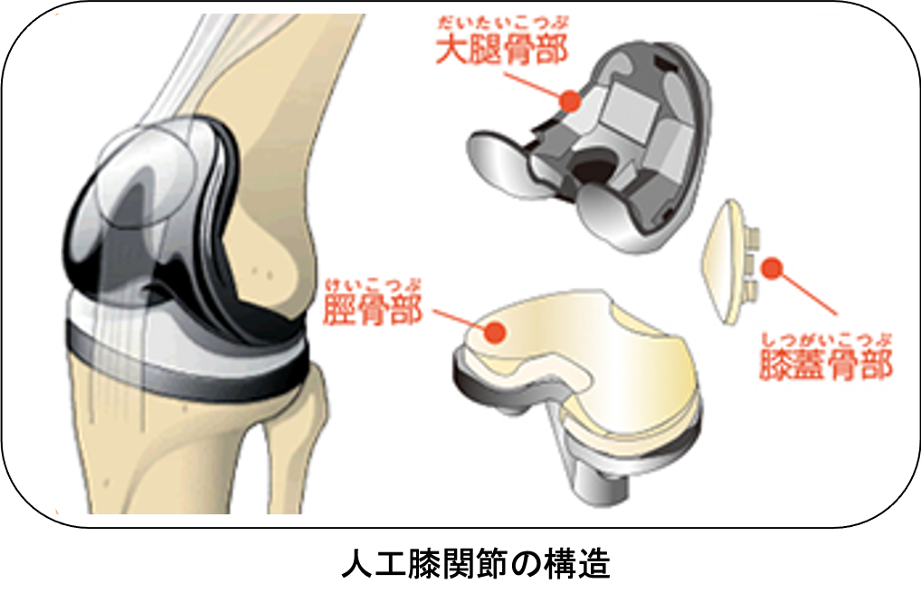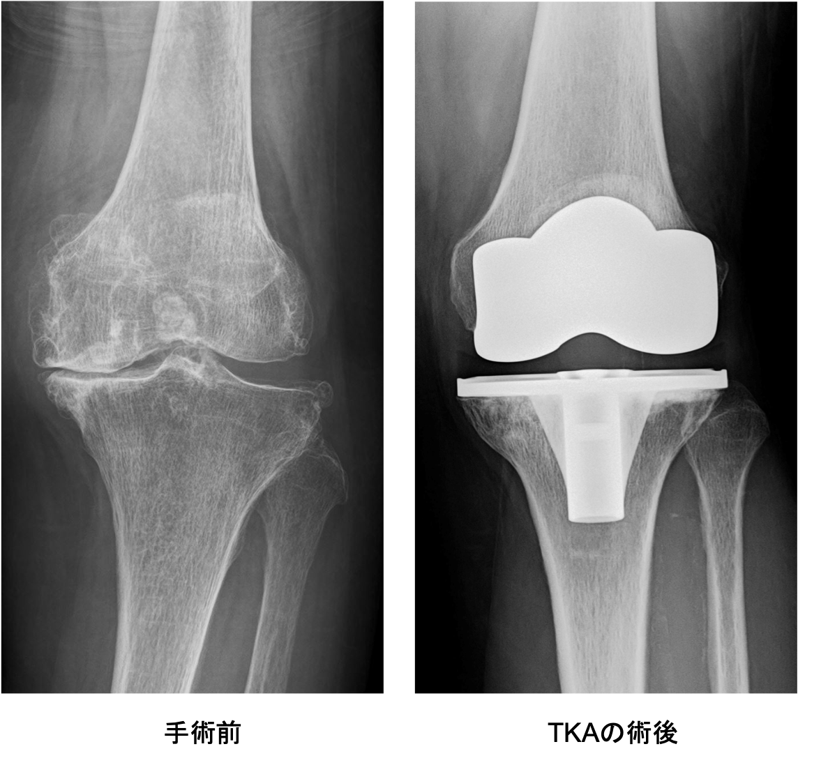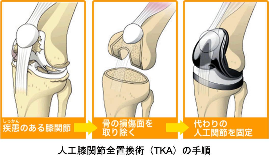 傷んだ関節表面を人工関節の形に合わせて削り、金属、セラミック、ポリエチレンでできた人工関節を骨の上に固定します。この手術を受けることで、関節の動きが滑らかになり、O脚やX脚といった変形が改善し、まっすぐな脚にすることが出来ます。人工関節の耐久性は10年間弛みなく日常生活が送れる可能性が95%以上といわれ、長期的にも安定した方法です。さらに最新の人工関節では性能が格段に良くなっており、20〜30年以上の機能することも十分期待できるようになってきました。