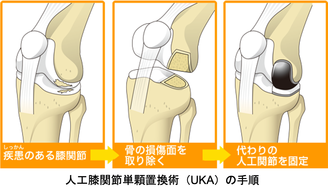 関節のなかで傷んだ部分だけ(多くは内側の半分だけ)を人工関節に置換します。メリットは手術の傷や削る骨の量が少ないため、術後の痛みも少なく、回復が早く、膝の曲がりもよいところです。耐久性も悪くありませんが、人工膝関節全置換術と比べると若干手技が難しく、適応をしっかり選ぶ必要があります。変形が比較的軽く、外側の軟骨や靭帯に異常がないなど、術前に専門医の診断を受けた上で、相談するようにしましょう。