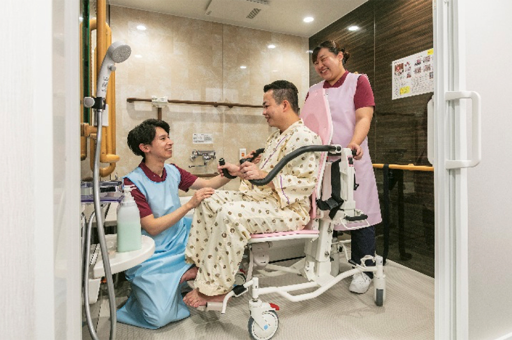個室浴室と機械浴室があり、患者様の病状に応じた浴室にて清潔に快適に過ごしていただけます。お一人で入浴できない患者様には、ケアアシスタントが安全に丁寧にお手伝いいたしますのでご安心ください。