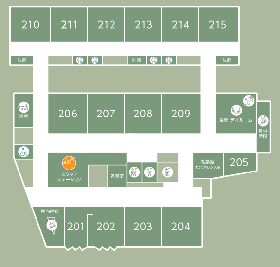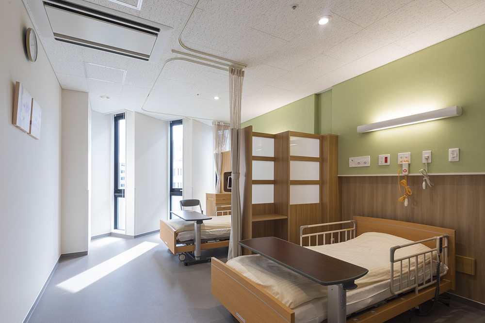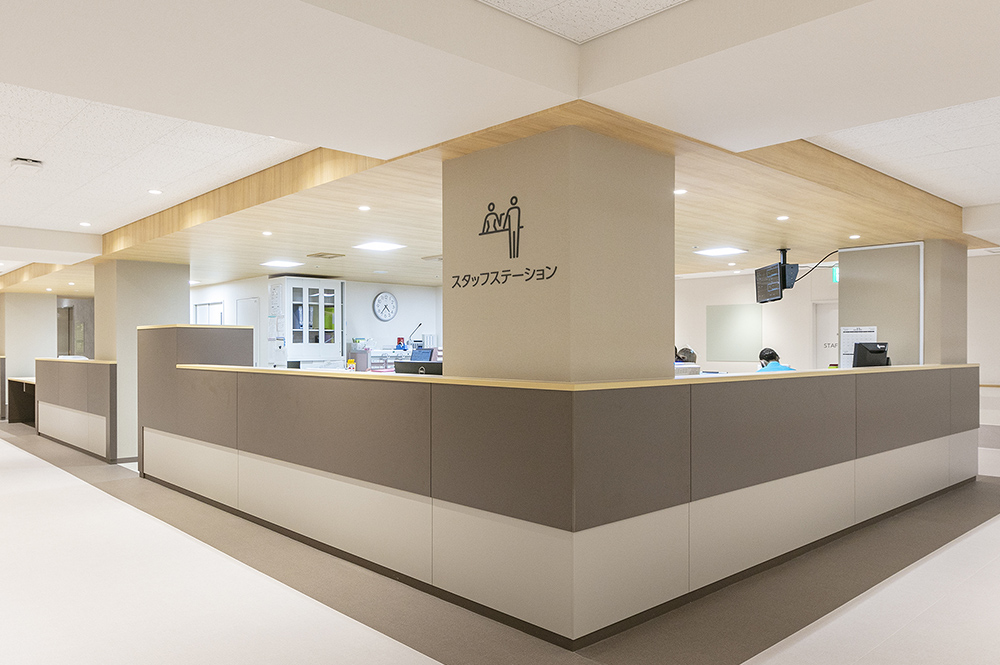 個室・2人部屋、4人部屋があり、患者様の病状やご希望に応じた環境で療養に専念していただけます。スタッフステーションは病棟の中央にあり、看護師・リハビリテーションスタッフ・薬剤師・管理栄養士・医療ソーシャルワーカーなどの多職種がいつでも対応できる環境があります。