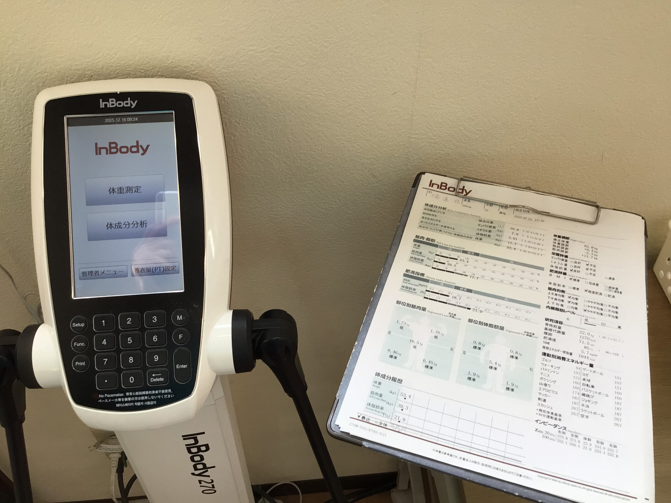 こんにちは!フェニックス梅島です。この機械は「インボディ」という体脂肪測定器です。より繊細に体組織を測定してくれます。利用者様には3カ月に一度は測定して数値で筋肉量を確認していただいています。日々の運動のモチベーションアップしています。