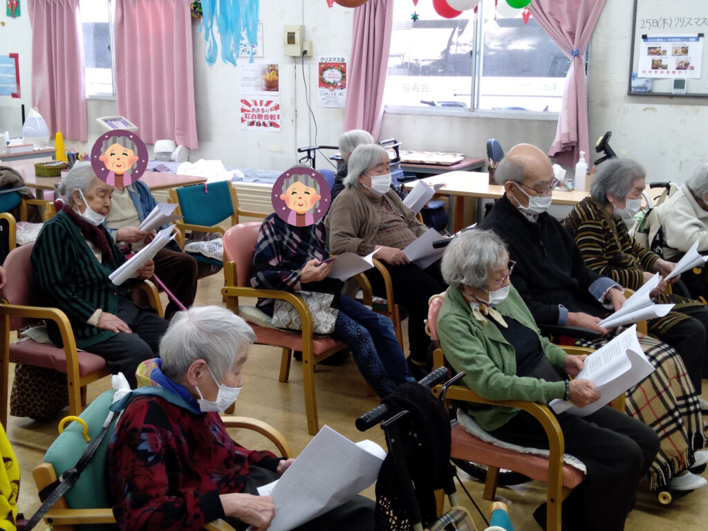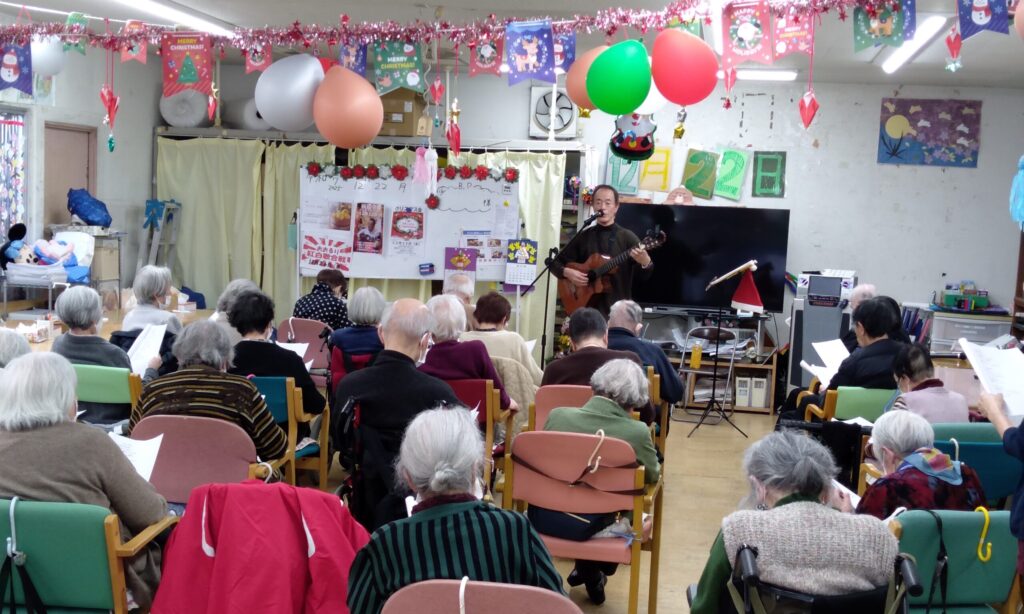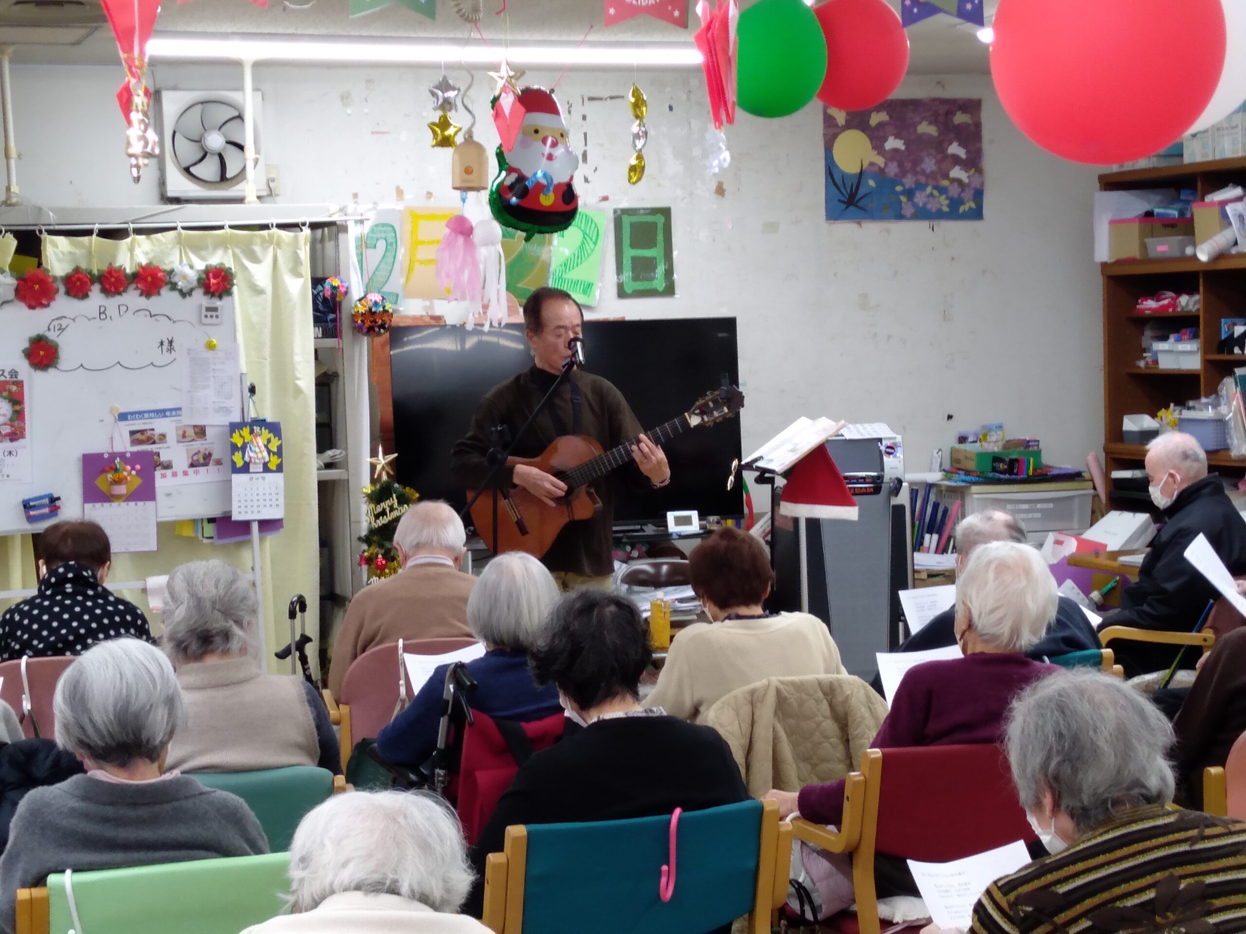 こんにちは、おおるりデイサービスセンターです!季節はもうすぐクリスマス…ということで、今回ギター演奏して下さる萩原様にお越しいただき、弾き語り演奏をしていただきました!