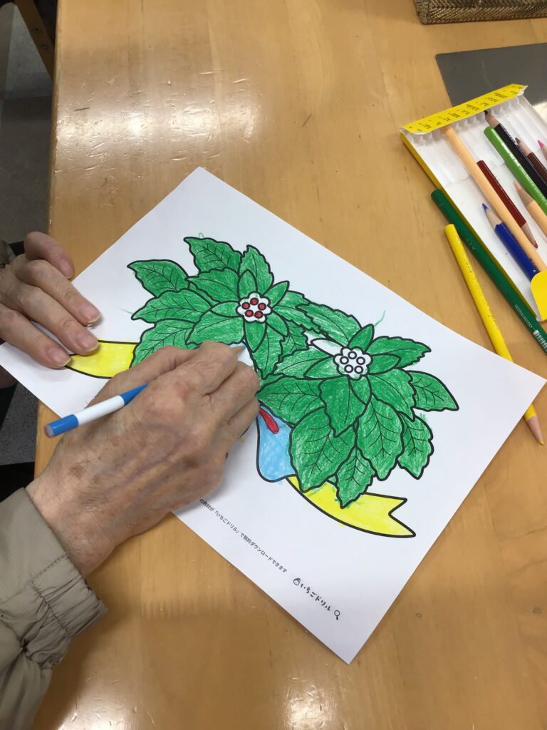午後の作業時間 こまどりデイ Facebook コピー 2025.12.22 今日は作業でお花を作っています。 茶色い毛糸は来年の干支、馬🐴になる予定です。 こちらはクリスマスの塗り絵です。 今日も充実した時間でした。