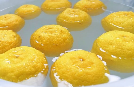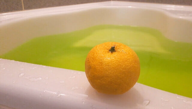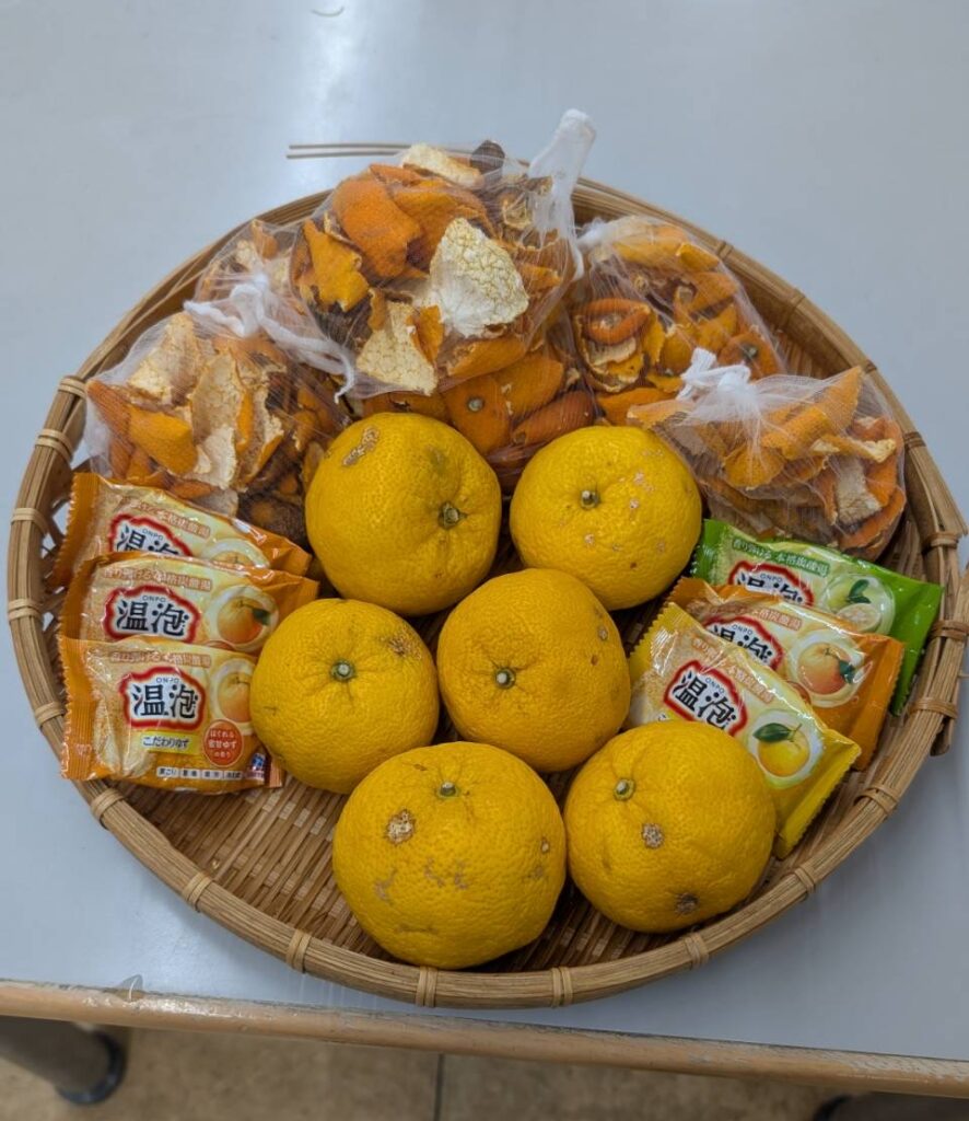 ゆずだけではなく、柑橘系の入浴剤天日干ししたみかんの皮をネットに入れて一緒に浮かべました。天日干ししたみかんの皮は浮かべると、うっすらオレンジ色に染まり、ふんわりほのかにみかんの匂いが香っており、皆様いいにおいがする」「ポカポカすると喜ばれておりました!