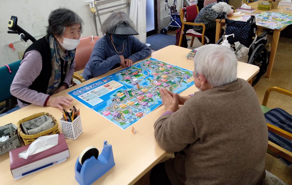 今回は、すごろくトランプを行いました。すごろくは、こちらでご用意致しました日本一周マップ世界マップリアル人生マップで行い、皆様さいころで自分のコマを進めておりました。一位でゴールした方は大喜びされておりました。
