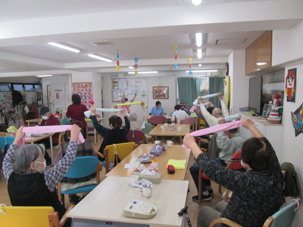 こんにちは、うぐいす梅島です。利用者様の体操の時間です。週変わりで内容を変えて体操をしています、今日はタオルを使った体操です。肩甲骨、肩、股関節の柔軟性の維持向上の目的で行っています。「毎回体操をしています、自宅だと運動はしないのでここに来て運動すると少し疲れるけど体の動きが良くなるように感じるよ」運動は続けることで効果を感じます頑張って続けましょう。