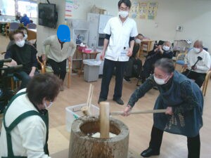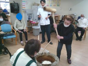 新年餅つき大会 おしどりデイDigital Camera Facebook コピー 2026.01.152026.01.18 今年も恒例の『新年餅つき大会』を開催しました! 杵と臼を使った本格的な餅つきで、「よいしょ~‼」の掛け声で皆さんと一緒にお餅をつきました。やはり年の功、スタッフよりも皆さんのほうが上手につかれていました。 終わった後は、お雑煮のほか、あんころ餅やからみ餅、きな粉餅など美味しく頂きました。