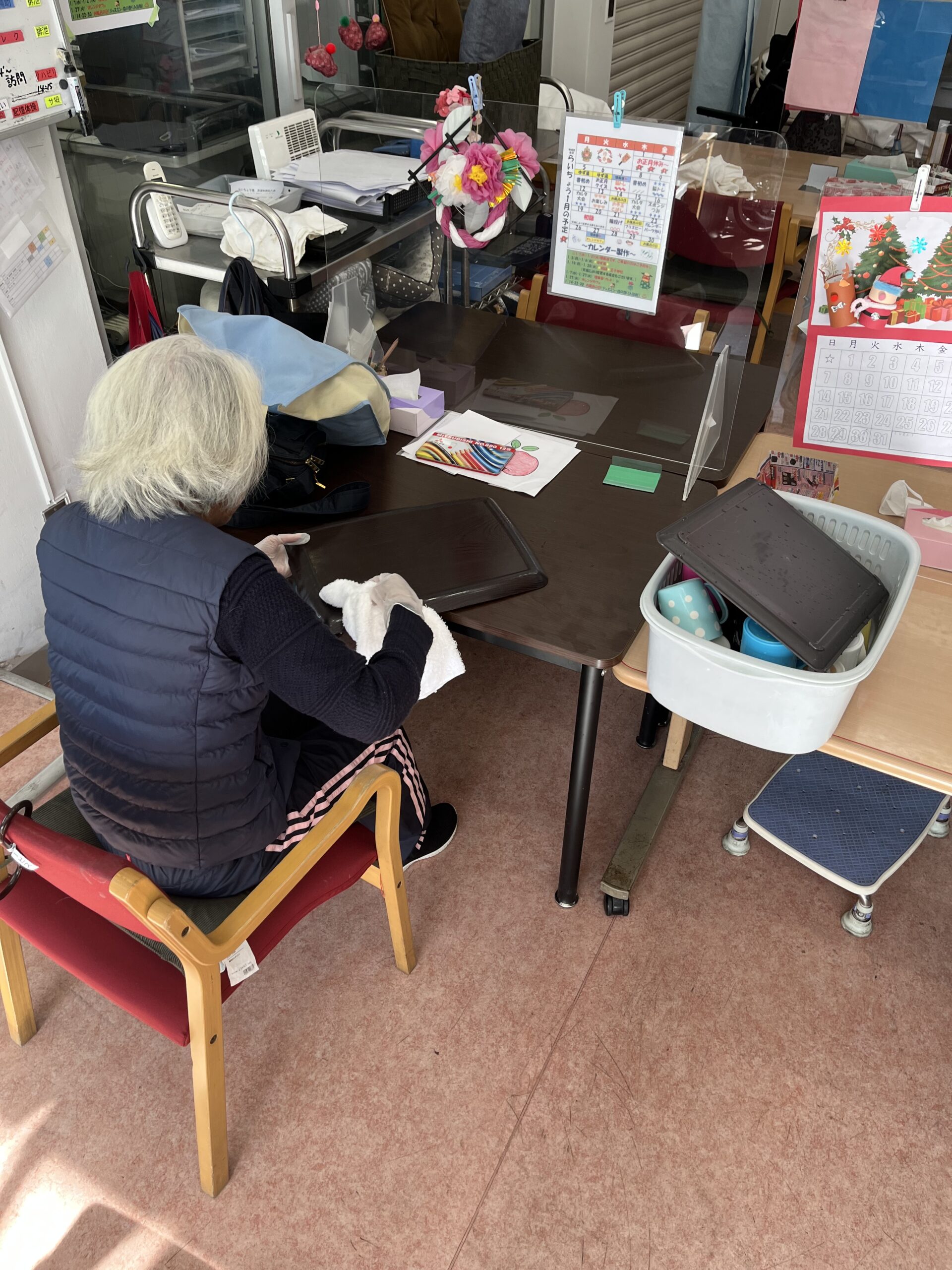 らいちょうでは生活リハビリとして様々な活動を利用者様と一緒に行っております。これまでご紹介したギターや書道などの活動だけではなく、日々お出しする食器を拭いていただいたり、得意なことを活かして活動に参加していただいています。