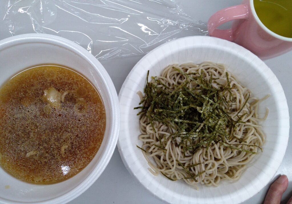 ネギ豚そばは、そばをネギ・豚肉・椎茸が入っているつけ汁と一緒にお出しして、つけ麺のようにいたしました。普段、食が細いような方も今日は全部食べれたわ」「(食事の量が)ちょうどよかったとつるっと召し上がっておりました!今回用意したつけ汁が少し濃い味だったので、皆様ほうれん草のおひたしを召し上がるとちょうどいい口直しになると喜ばれておりました!