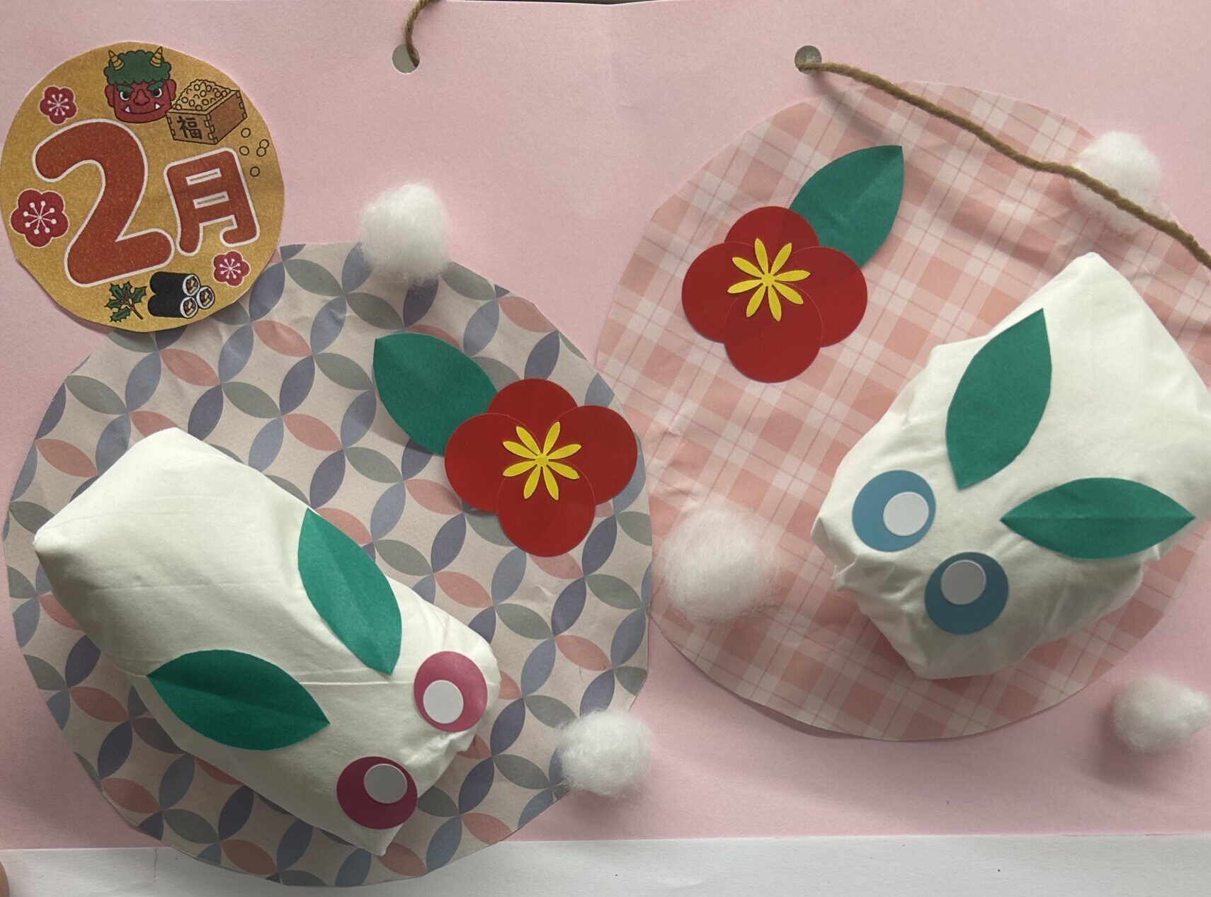 来月2月は雪うさぎをメインにしたカレンダーとなっております。雪うさぎティッシュをくるんで、立体感が出るように作っております。出来上がったものにシールを貼り、目も作りました!可愛らしい雪うさぎに皆様可愛い!」「ティッシュでできるなんて…と驚きの声も聞かれました。