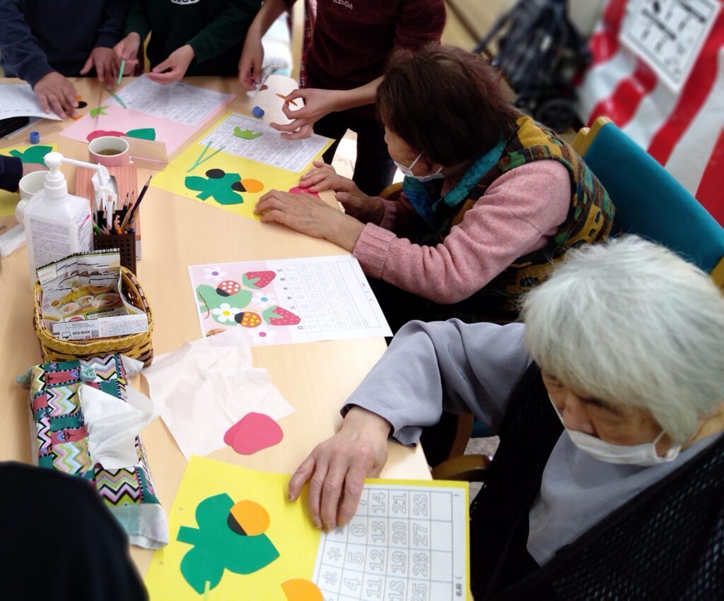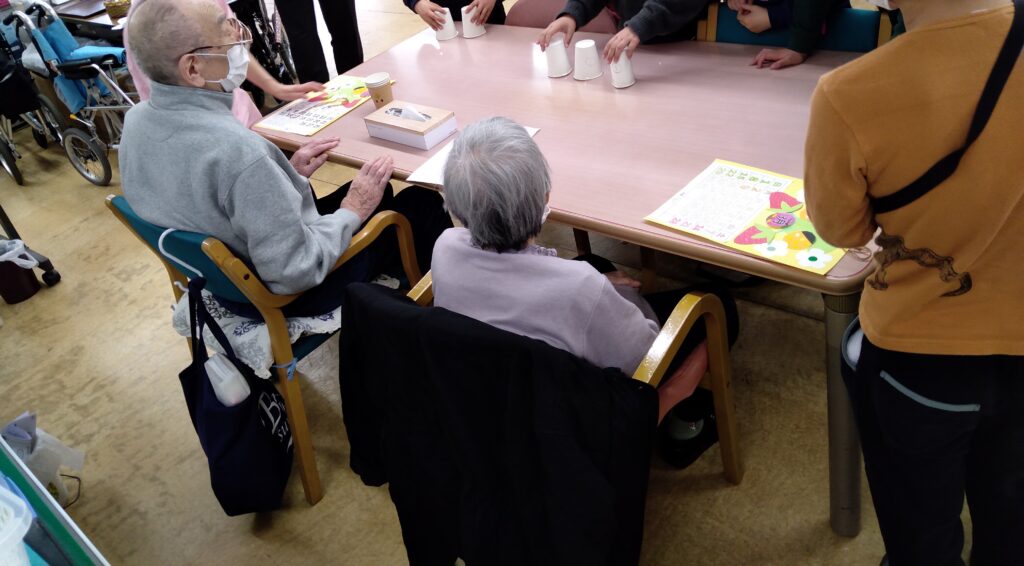 その後は、学生さんたちも出し物を用意して下さり、各テーブルに分かれてオセロやトランプ、自作のすごろくやおはじき、紙芝居の読み聞かせやベーゴマや紙風船などを一緒に遊ばれて楽しまれておりました。学生さんたちも「もっと一緒に遊びたい!」「楽しかった」と話されている子もいらっしゃりました。学生さんたちが帰った後は「すごい元気だったわね!」「たくさん元気をもらっちゃった!」と皆様笑顔で話されておりました!