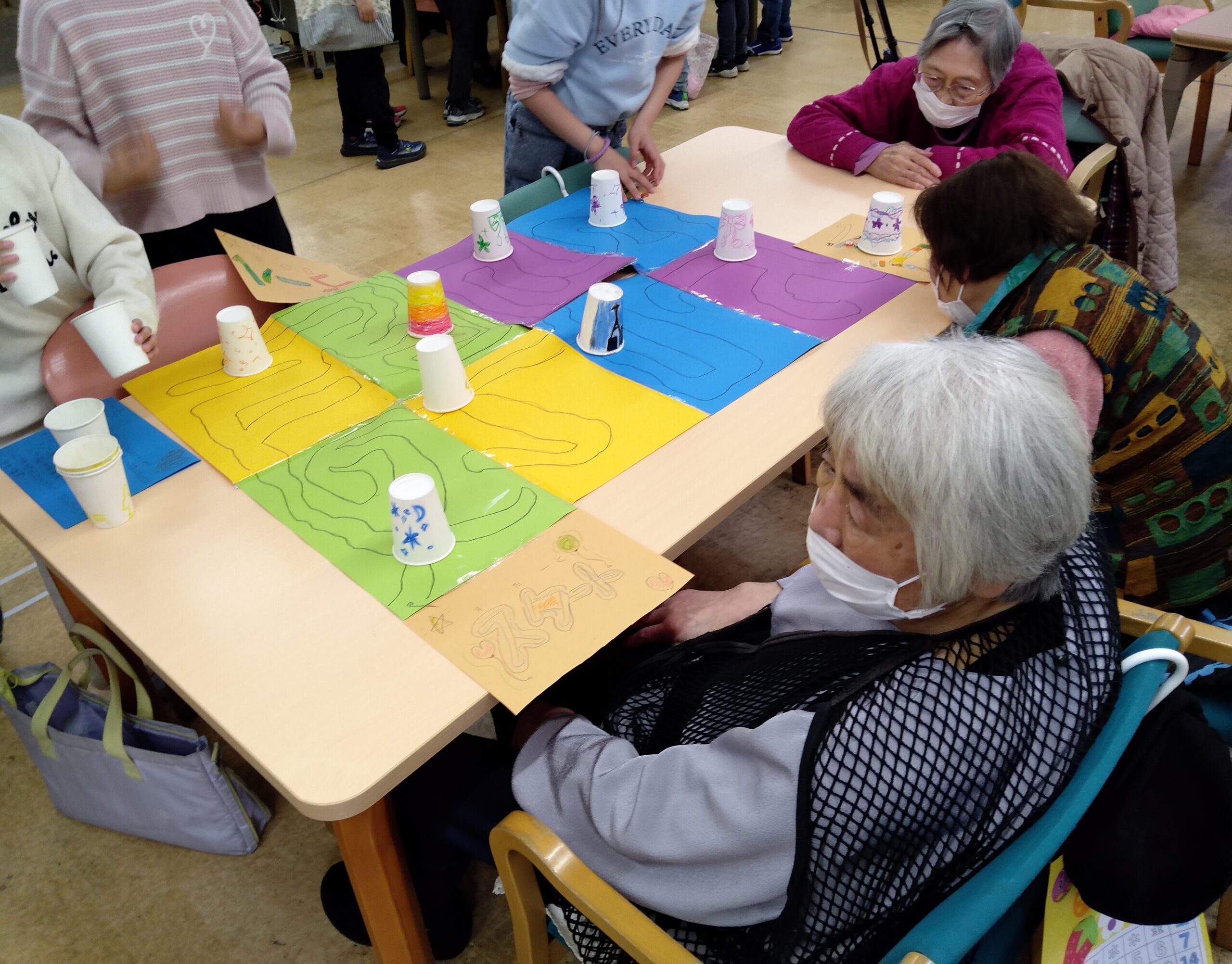 その後は、学生さんたちも出し物を用意して下さり、各テーブルに分かれてオセロやトランプ、自作のすごろくやおはじき、紙芝居の読み聞かせやベーゴマや紙風船などを一緒に遊ばれて楽しまれておりました。学生さんたちも「もっと一緒に遊びたい!」「楽しかった」と話されている子もいらっしゃりました。学生さんたちが帰った後は「すごい元気だったわね!」「たくさん元気をもらっちゃった!」と皆様笑顔で話されておりました!