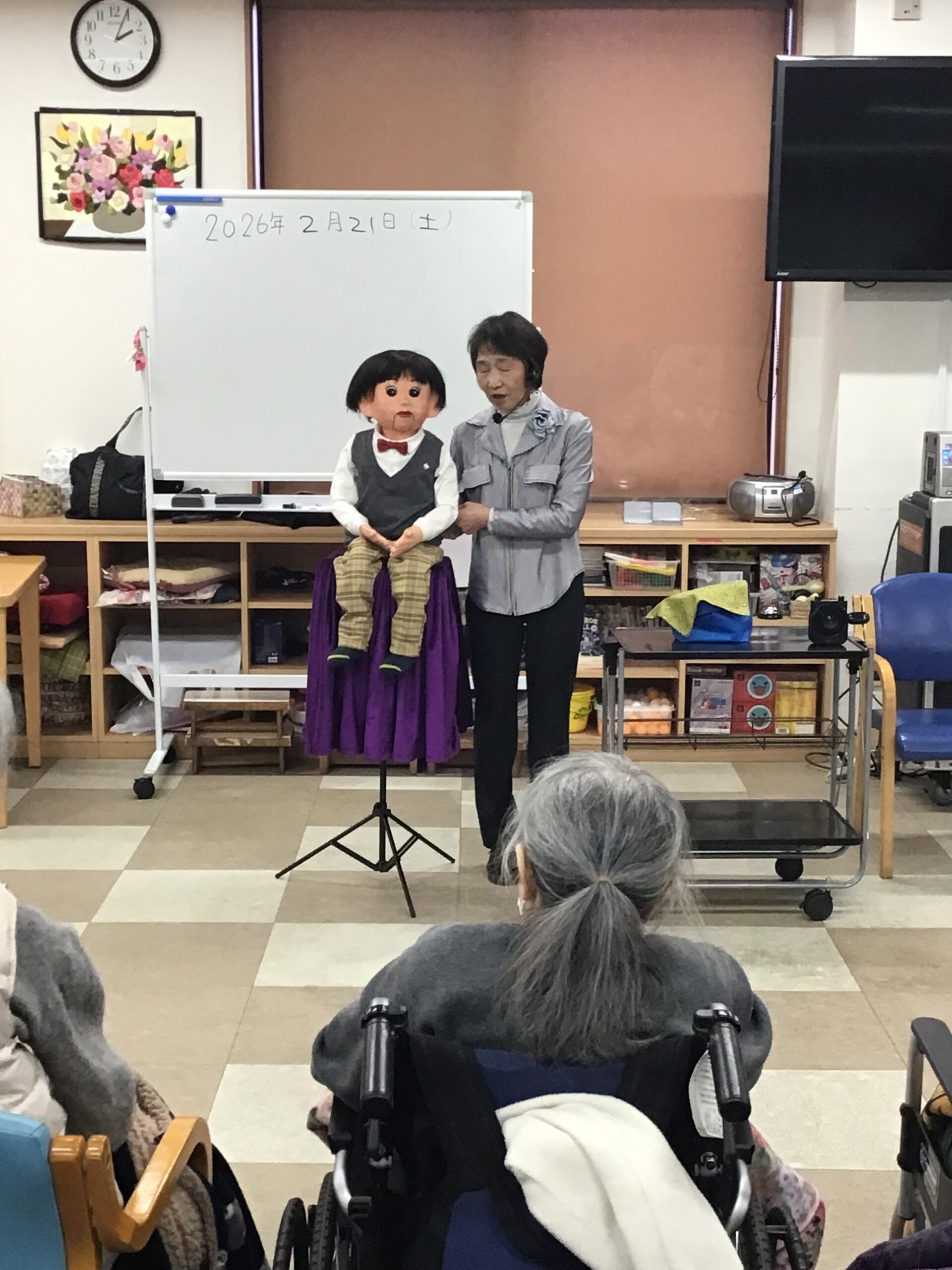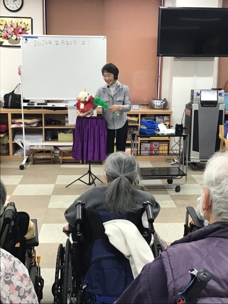 腹話術の方がお見えになりました(^^)/ こまどりデイ Facebook コピー 2026.02.24 先週土曜日21日に初めてのボラさん。腹話術の方が来られました。 いちこさん、男の子のこうちゃん、羊のメイちゃんです。こうちゃんは目隠しをした状態で利用者様が持っていた果物を見事に当てる事が出来ました。凄いですね また来てほしいですね(^^)/ いっこく堂さんはテレビで見た事ありますが、実物を見るのは初めてで 皆さんとても真剣に見てましした!(^^)!