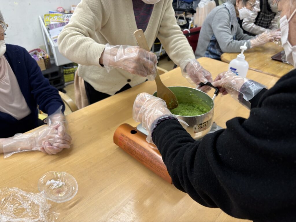 味は、「みたらし、あんこ、きなこ、ずんだ」の4種類。あんこは練って柔らかくし、ずんだも火にかけながら丁寧に混ぜて作りました。「練るのも大変ね」「重くなってきた…」と苦戦されている様子が見られました。お団子は、白玉粉に豆腐を混ぜて、耳たぶくらいの柔らかさになるように調節していただいたものを丸めて、茹でました!「丸めるのも難しいわね…」「でも楽しい!コツがわかってきた!」と楽しまれながら丸めました。