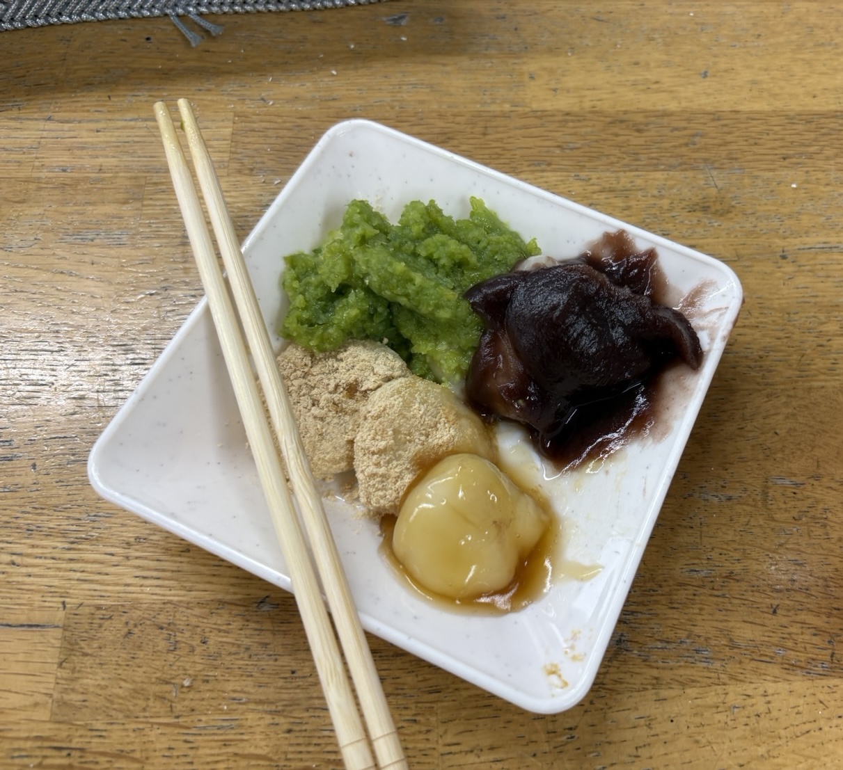 味は、「みたらし、あんこ、きなこ、ずんだ」の4種類。あんこは練って柔らかくし、ずんだも火にかけながら丁寧に混ぜて作りました。「練るのも大変ね」「重くなってきた…」と苦戦されている様子が見られました。お団子は、白玉粉に豆腐を混ぜて、耳たぶくらいの柔らかさになるように調節していただいたものを丸めて、茹でました!「丸めるのも難しいわね…」「でも楽しい!コツがわかってきた!」と楽しまれながら丸めました。