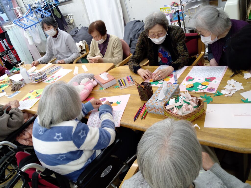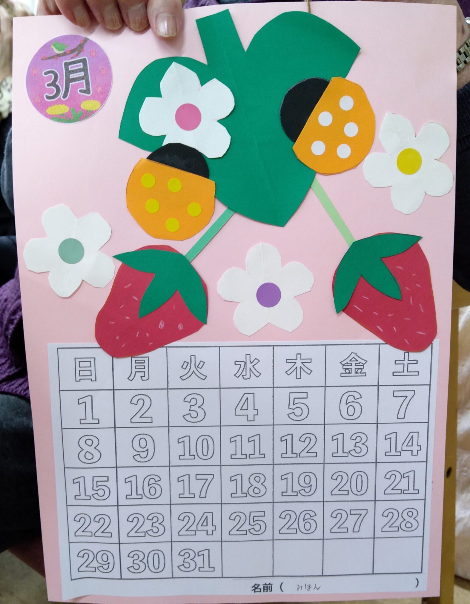 3月の持ち帰りカレンダーはイチゴとてんとう虫をモチーフにして作りました。イチゴの粒は白の色鉛筆で丁寧に書いていただきました。てんとう虫の背中の模様は画用紙にシールを付けて再現。皆様完成したものを「可愛いのが出来た」「お家に飾るわ」と喜ばれておりました!