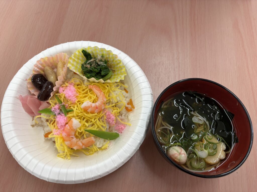 翌日にあたる本日は、お昼に「ちらし寿司」と「すまし汁」をご用意いたしました!ちらし寿司はたくさんおかわりしていただき、皆様お腹いっぱいになるまで召し上がっておりました!