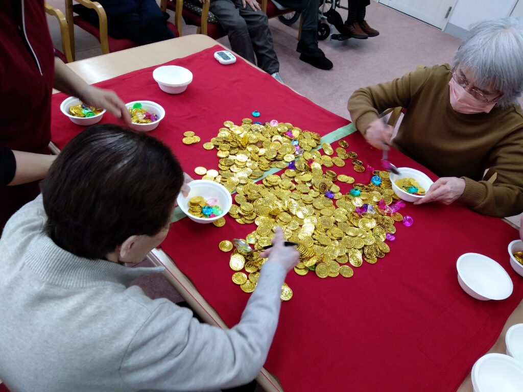 らいちょう『コインすくいゲーム』 らいちょうデイ Facebook コピー 2026.03.13 地域密着型らいちょうデイサービスセンターです。 本日は コイン すくいゲームを行いました。キラキラと目を引くコインですが、大きさが小さく 手先の器用さが必要なゲームでした。 皆さんとても集中して行っておりました。