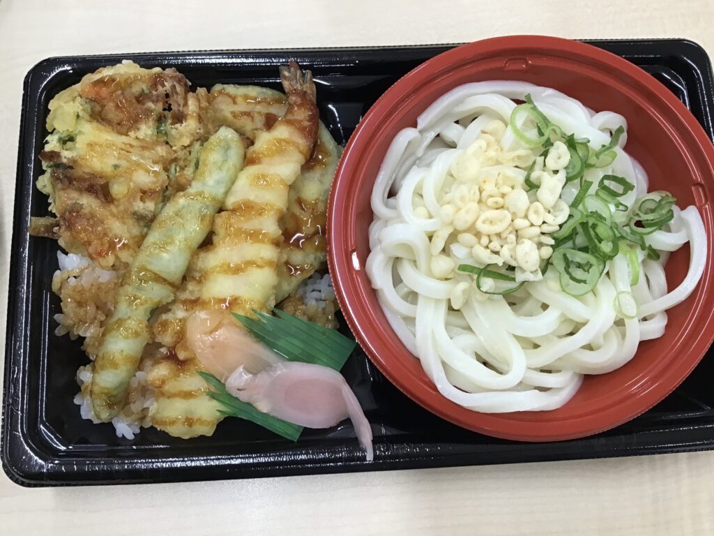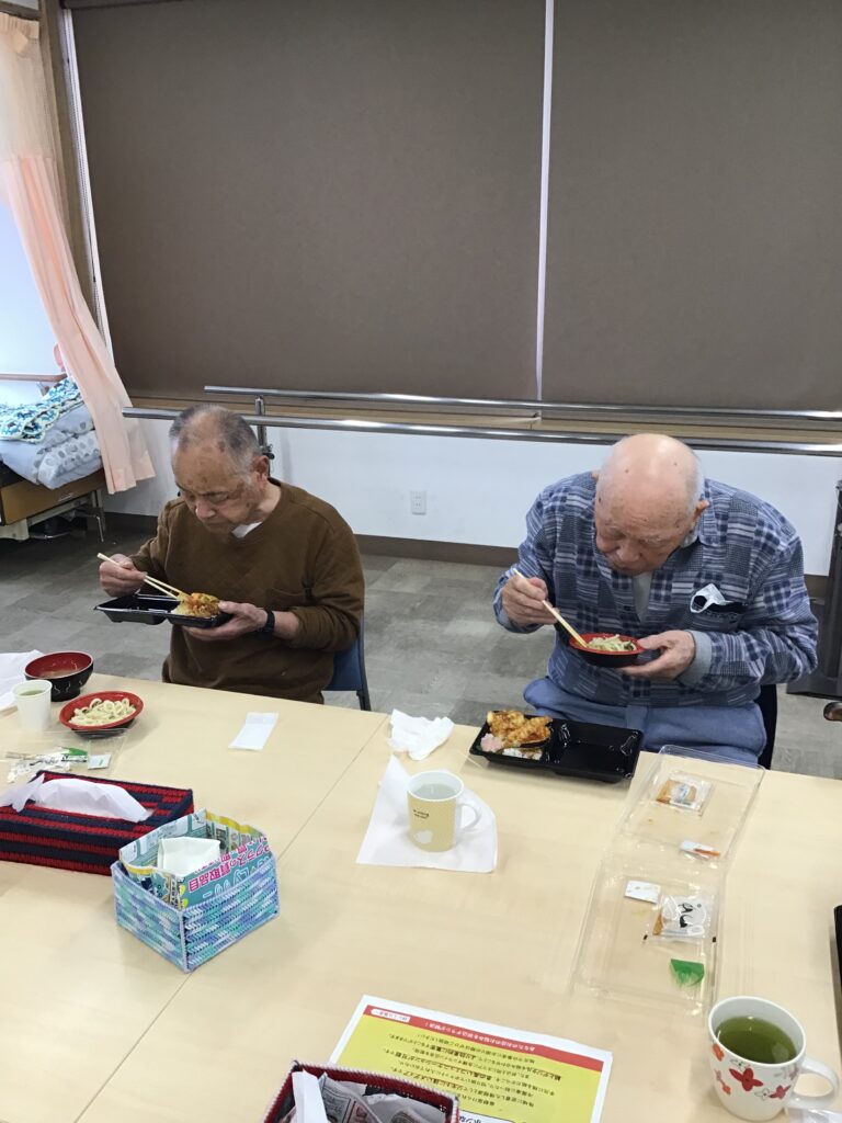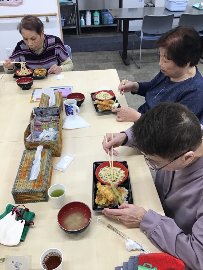 「変わり昼食の日」 こまどりデイ Facebook コピー 2026.03.26 こんにちは😃こまどりデイです( ◠‿◠ ) 本日は変わり昼食の日と言う事でベルクスからお弁当が来ました。 「天丼とうどんセット」です。いつもと違う昼食に皆様喜ばれていました。完食された方がほとんどでしたよ🙂天ぷらはなんと4種類もありました。