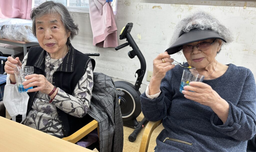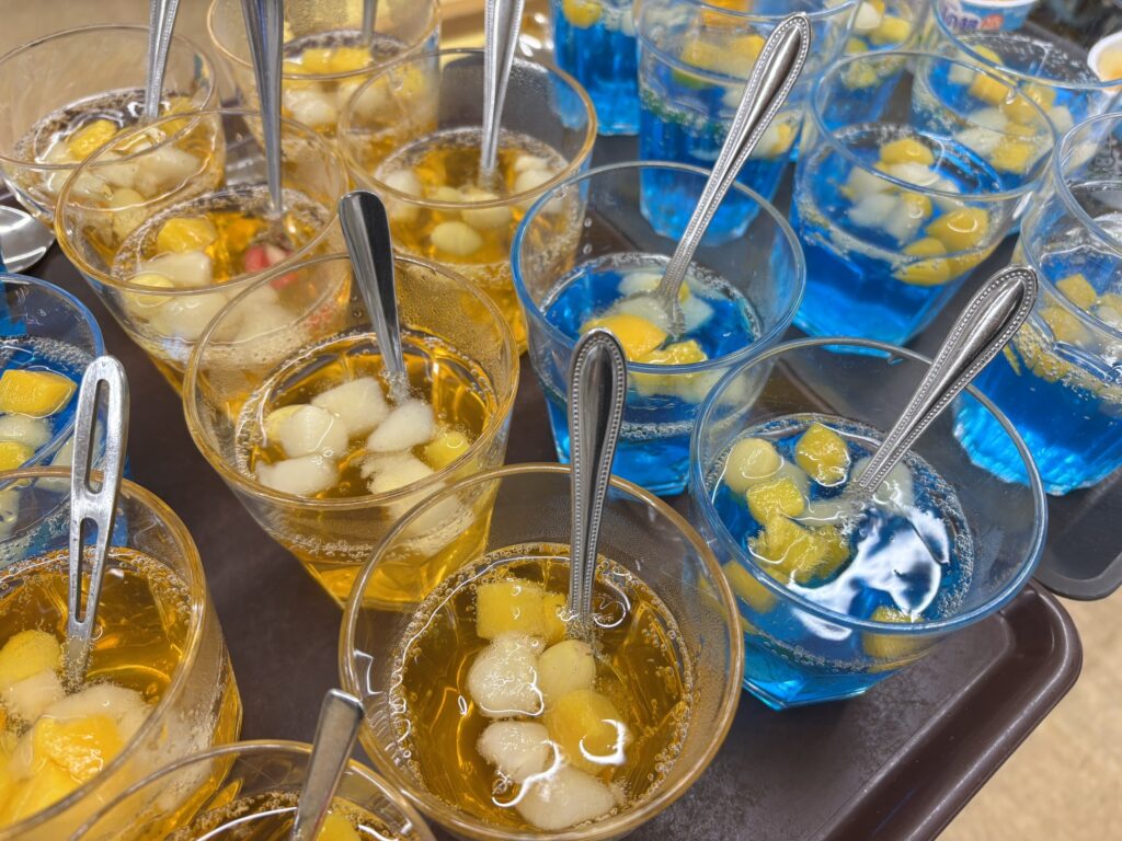 今回は、かき氷のシロップを使用し、ゼリーを作りました。上に果物をのせて、サイダーを注ぎ、まるでフルーツポンチのような味わいに!見た目も青色・オレンジ色と色鮮やかで「可愛いらしいわね」「綺麗・・・」と皆様お喜びでした!味も皆様「美味しい!」と召しあがっておりました!