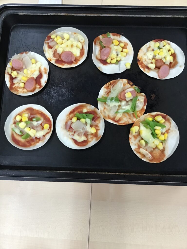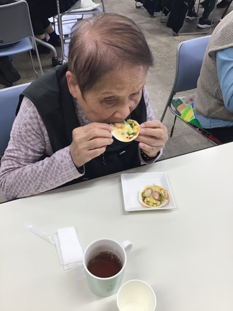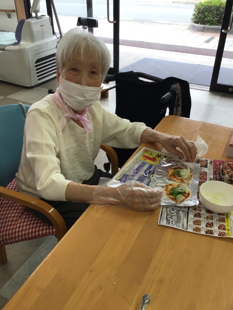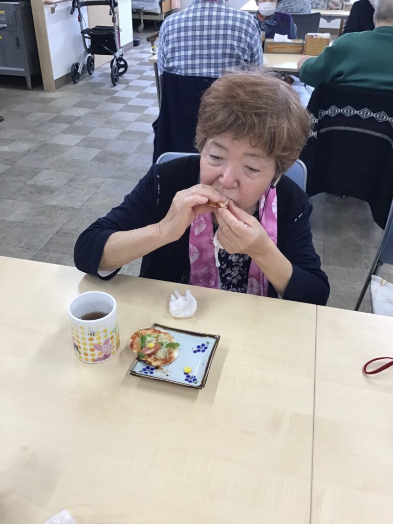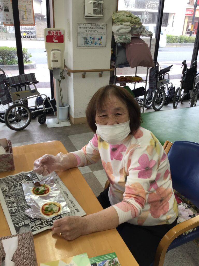 手作りおやつで「ミニピザ🍕」 こまどりデイ Facebook コピー 2026.04.06 こんにちは😃こまどりデイです。 今日のこまどりではおやつ作りを行いました。餃子の皮を使ってミニピザを皆さんで作りましたよ😄具材を切ってケチャップを塗り、その上に切った具材を乗せてホットプレートで焼きました。チーズも乗せて美味しそうです♪ 皆さん「美味しかったわ〜」と笑顔でした😋ご自宅でも簡単に出来るので「作ってみるわ」とおっしゃる方も居ました。また、何か作りたいですね😉