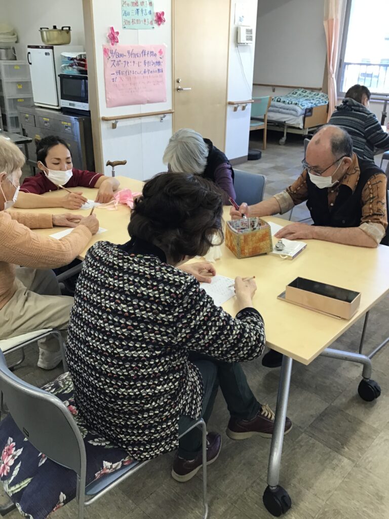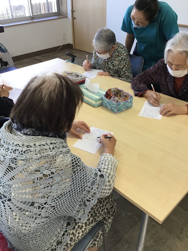 散歩に出掛ける前に「言葉かくれんぼ脳トレ」を皆さんで行いました。