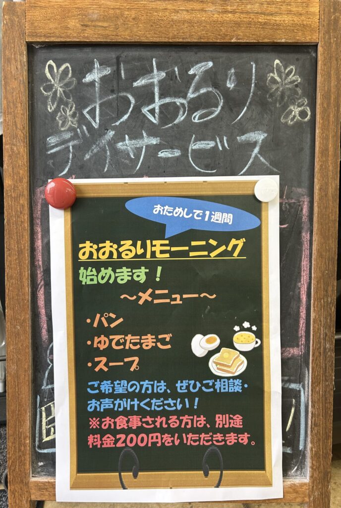 また、今週1週間お試しで朝食の提供を行っております。朝ご飯を召し上がる時間がない方や朝薬を服薬できてない方向けにご用意をさせていただいております。提供料金として200円頂戴いたしますが、「すごく助かる」との声もいただけております。今週1週間のお試し、期間限定となっておりますので、ぜひお試しください!