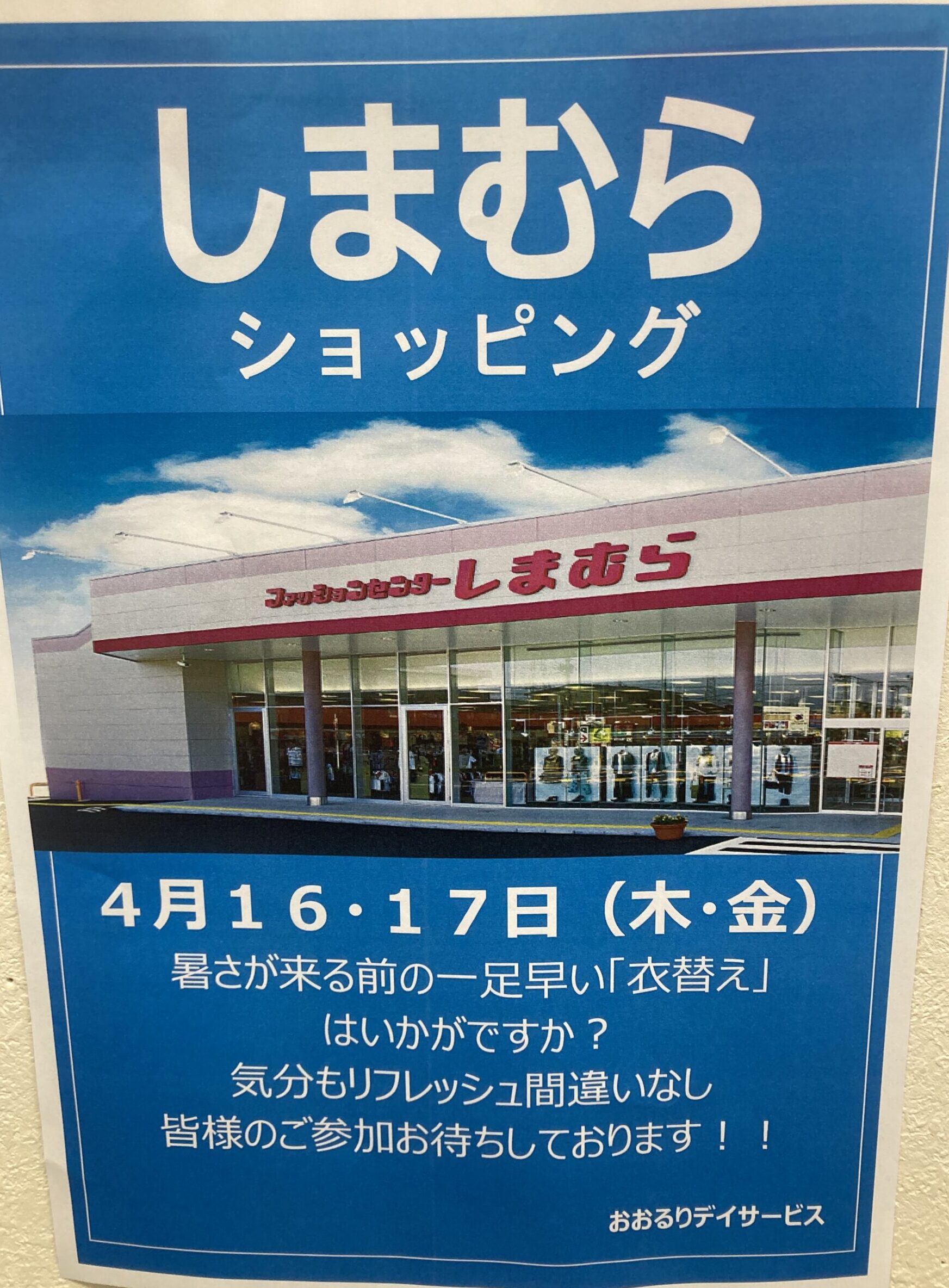 行事のお知らせは、4月16日(木)・17日(金)の2日間で春物や暑さ前の衣替えなどの目的で「ファッションセンター しまむら」に買い物外出を予定しております。目的地までのドライブなどの気分転換にもなればと思っておりますので、ぜひご参加をご検討していただければと思います。