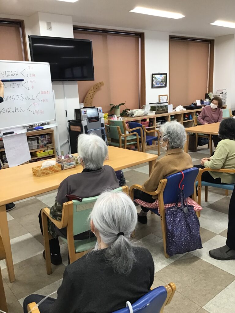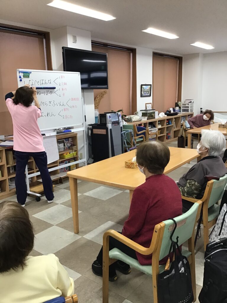 「脳トレ」 こまどりデイ Facebook コピー 2026.04.10 こんにちは😃こまどりデイです。 今日は微妙なお天気の為散歩には行かず室内で体操をしっかりと行いました。希望された方は買い物へ行かれています。 その後は脳トレ問題を皆さんで行いました。 文字を並べ替え2つの言葉が出てくるクイズを行いました。皆さん真剣で頭を一生懸命捻っていました。