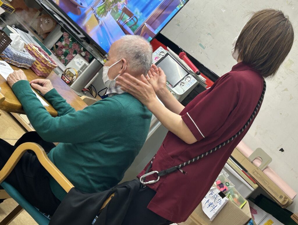 本日、希望者の方にはネイルを行いました。手元だけでもおしゃれにしたいわ女性の方に大好評!さらにネイルの上から絵を描いてもらう季節感があっていいわねなんか自分が綺麗に見える自信がつくわ!大変好評でした。男性の方には肩たたきマッサージを行いました。リラックスされており肩が軽くなっ気がすると喜ばれておりました!