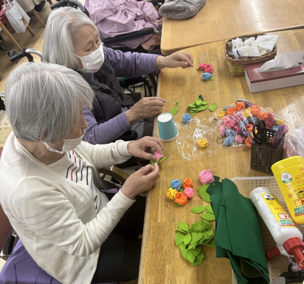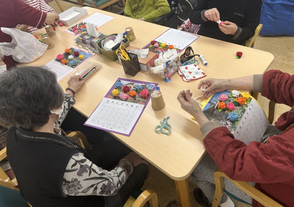 5月は「都電とバラ」をモチーフにして作っております!皆様にフェルトでバラの花を作っていただいております。縦長のフェルトの真ん中に切り込みを入れて煮物の昆布の様にねじったものをくるくると巻いて立体的に仕上げていきました。細かいパーツは作ることに苦戦されている方も多かったですが、パーツが完成すると、「簡単にできるのね!」と。完成した方は、「いいものが出来た」「すごく華やか!」と喜ばれておりました。
