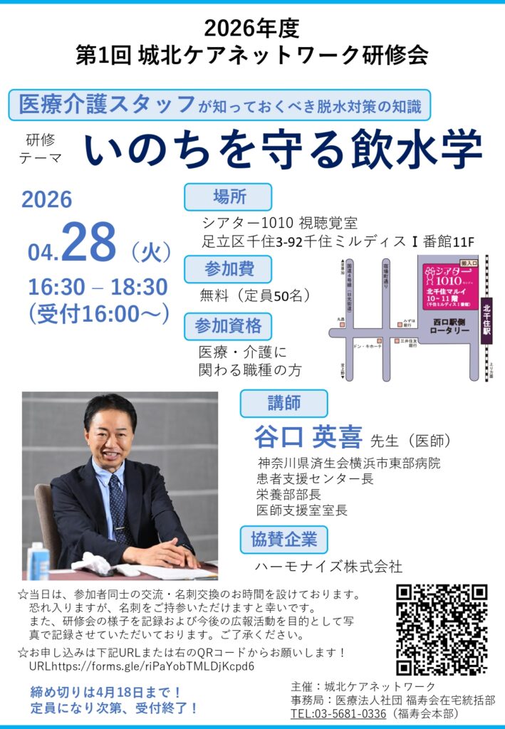 2026年4月28日(火)16:30より、「いのちを守る飲水学」をテーマに、脱水対策に関する研修会を開催いたします。