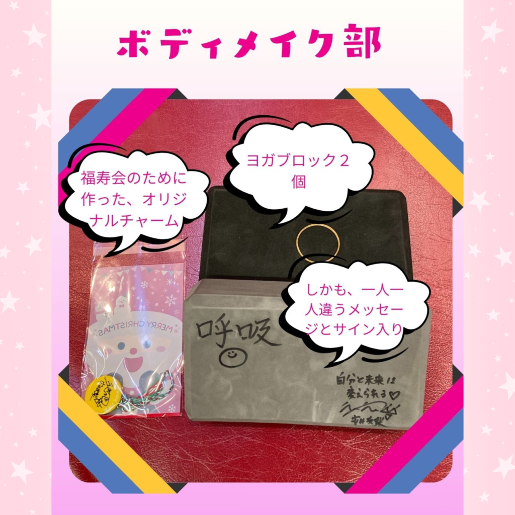 12月のボディメイク部では、安井先生より、部員全員にオリジナルチャームとヨガブロック2個のプレゼントをいただきました。
